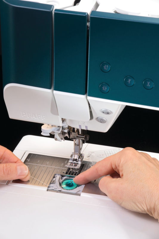Gebruik verschillende garenklossen in diverse afmetingen. Dankzij de uitschuifbare telescoopgeleider wordt het garen altijd perfect getransporteerd. De intelligente ActivStitch technologie zorgt voor een absoluut nauwkeurige draaddoorvoer. Ook luxe metallic garens worden probleemloos verwerkt. De sensor meet de dikte van de stof en reguleert de hoeveelheid garen.